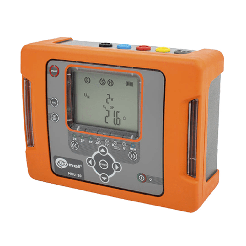 El medidor MRU-30 tiene un carácter sorprendentemente versátil. El dispositivo se puede utilizar para medir conexiones de puesta a tierra simples y múltiples con las pinzas o electrodos adicionales. Las características adicionales de este práctico dispositivo es la medición de la resistividad del suelo utilizando el método de Wenner, así como la verificación de la continuidad de conexiones compensatorias y protectoras. La ventaja del medidor Sonel MRU-30 es también la clara transmisión de información que advierte al usuario sobre posibles amenazas o irregularidades detectadas. La información aparece en la pantalla antes y después de realizar la prueba.